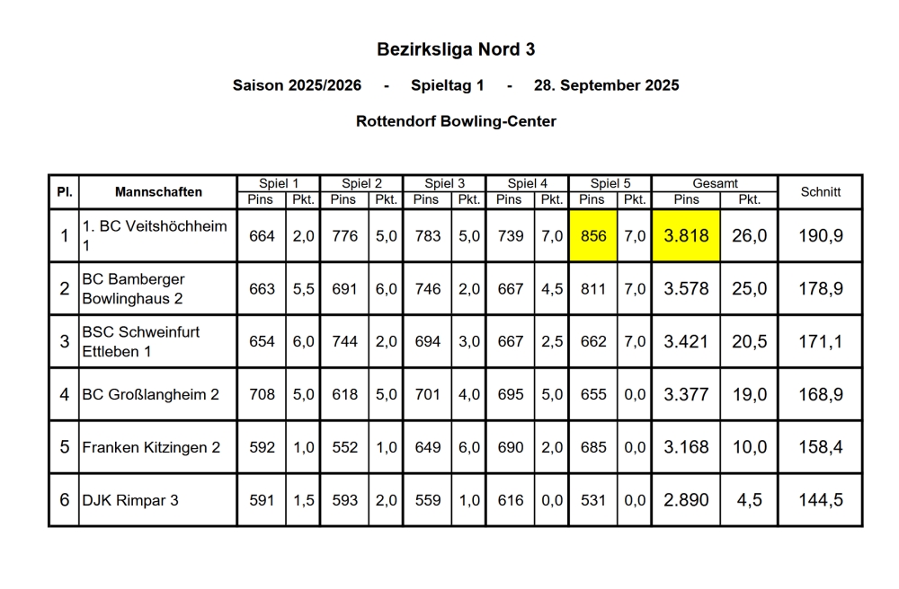 Tagestabelle der 2. Mannschaft vom 1. Spieltag